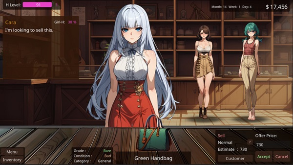 Pawn Pleasure is a story driven visual novel with fantasy elements and shop management mechanics. The core idea is simple but interesting. You run a pawn shop and interact with women from different backgrounds who arrive with items, personal problems, and unique requests. Your role is not only to evaluate goods but also to decide how to respond to each customer.